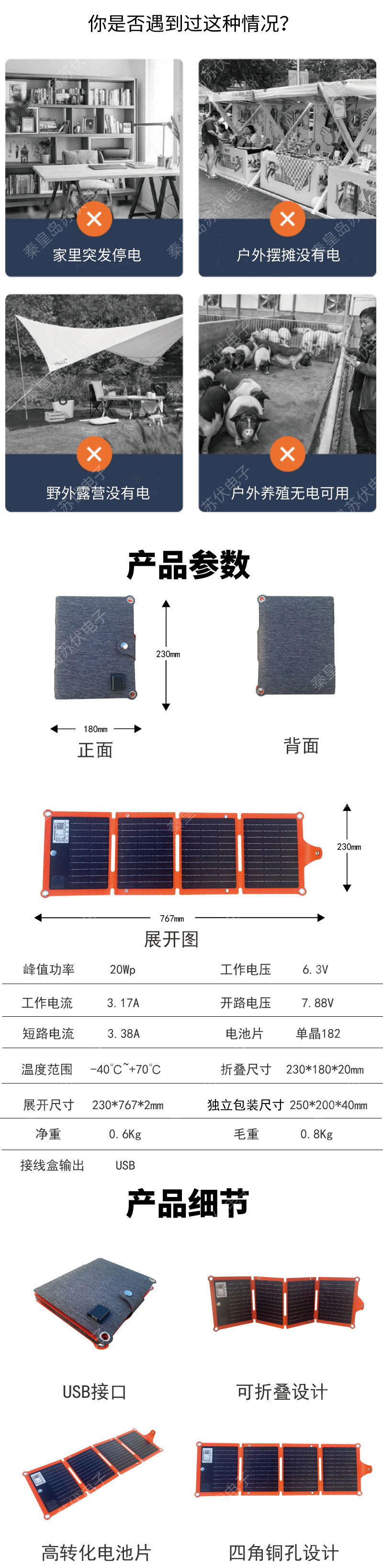 20W戶外小功率太陽能折疊包單口USB快充手機(jī)野外登山多顏色可選